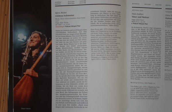 UPDATE: Gülden’s Schwester wurde von der Akademie der Darstellenden Künste mit der Auszeichnung Hörspiel des Monates bedacht. Zur Begründung der Jury hier entlang. https://www.br.de/mediathek/podcast/embed?episode=1799937 Derya Yıldırım, Tobias Levin and I… Read more Hörspiel: Gülden’s Schwester →